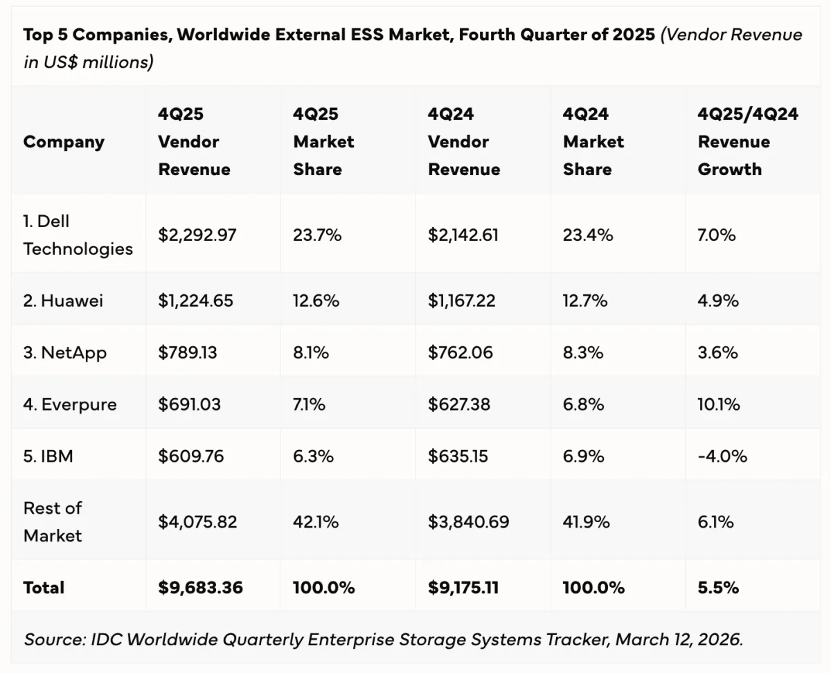 Everpure took fourth place with a 7.1% share after recording double-digit quarterly growth. IBM rounded out the top five with a 6.3% market share.